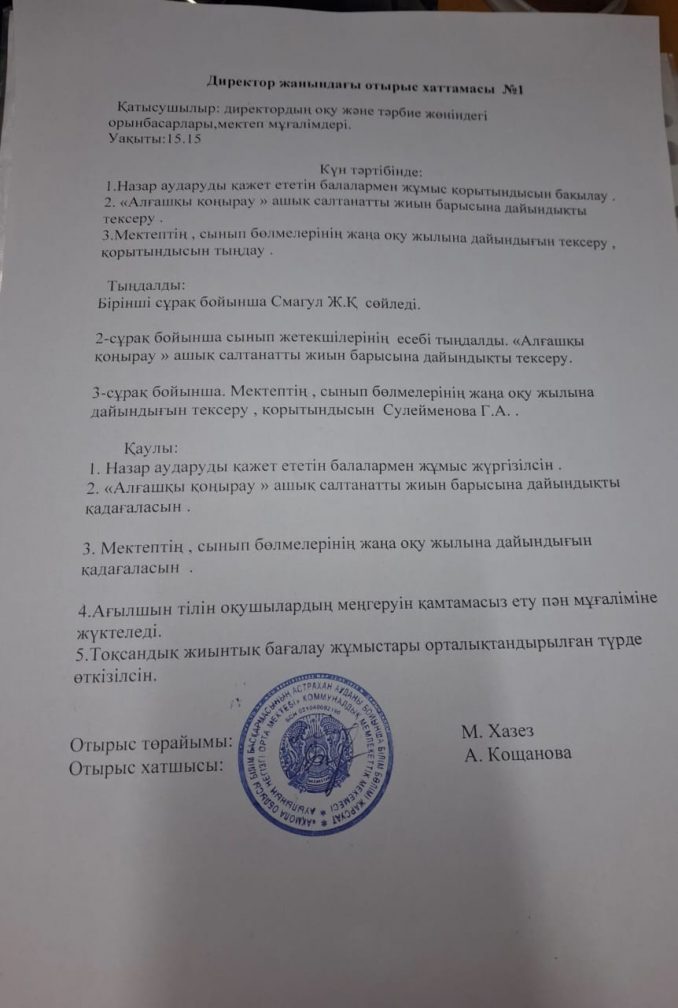 Директор жанындағы отырыс хаттамасы №1 2025-2026 оқу жылы